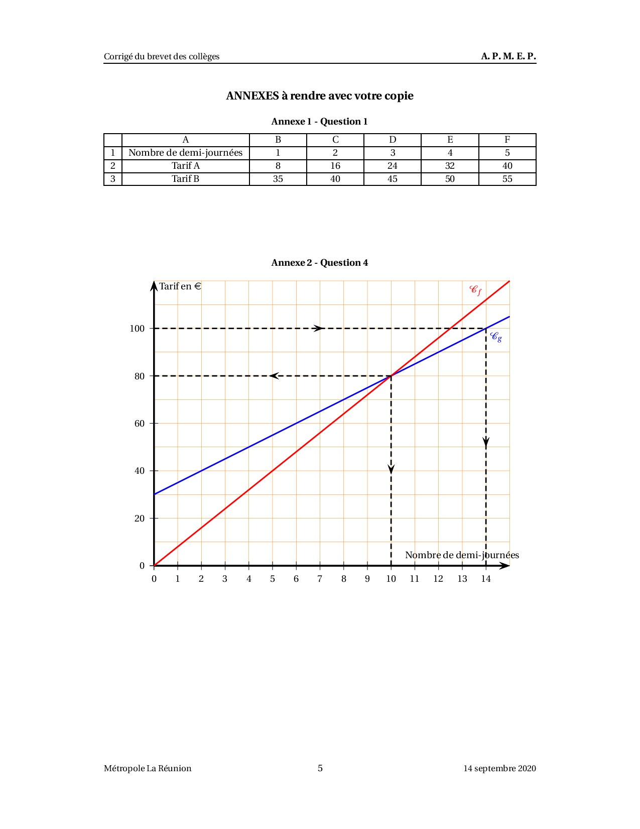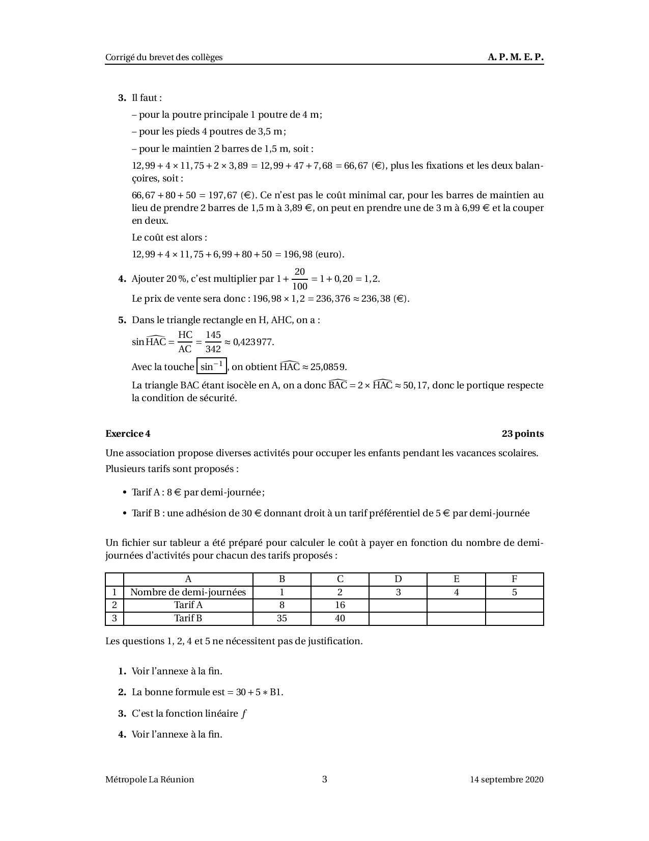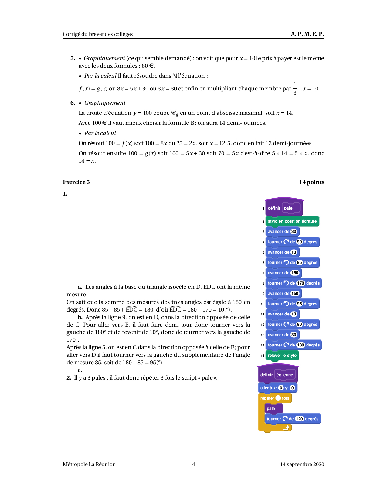 Brevet Maths Métropole La Réunion septembre 2020 - Corrigé