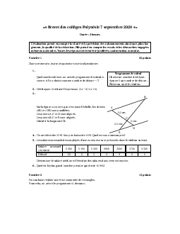 Brevet Maths Polynésie septembre 2020 - Sujet