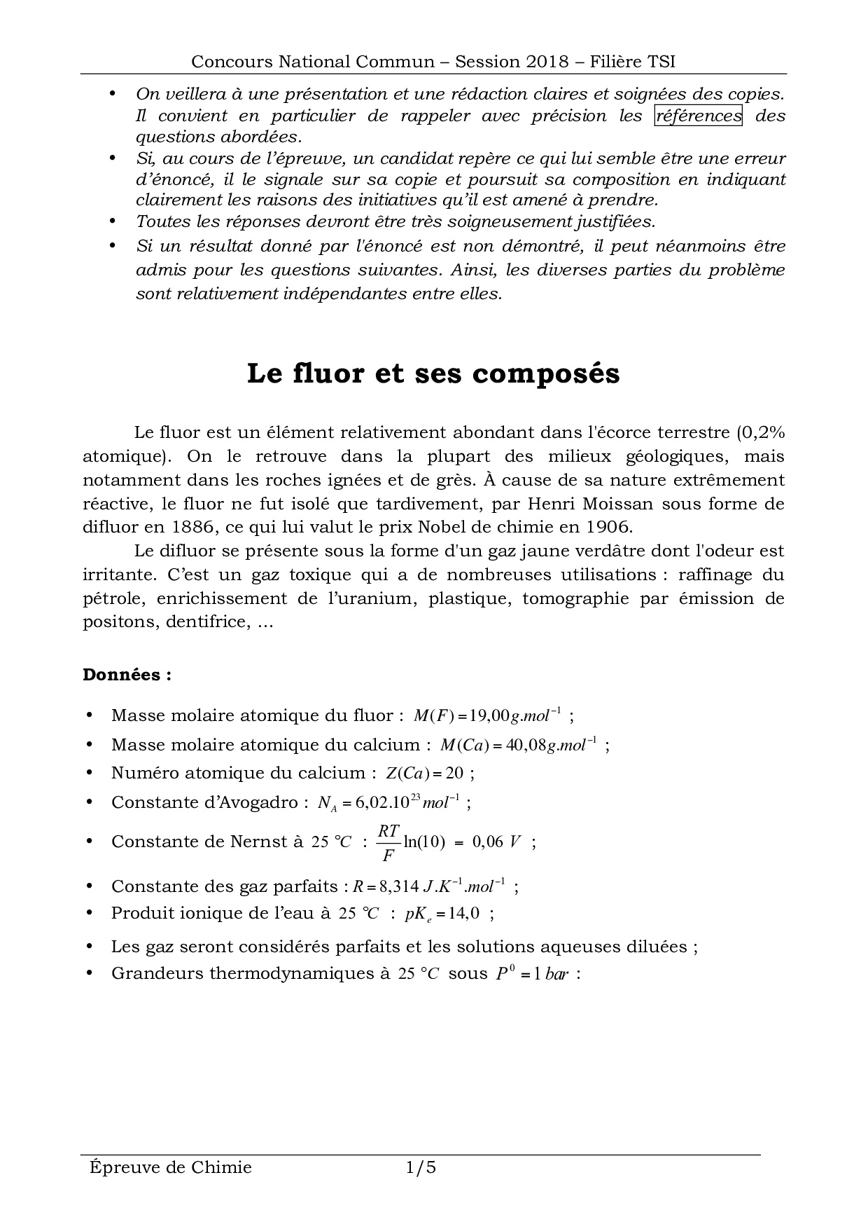 CNC TSI 2018 Chimie - Sujet