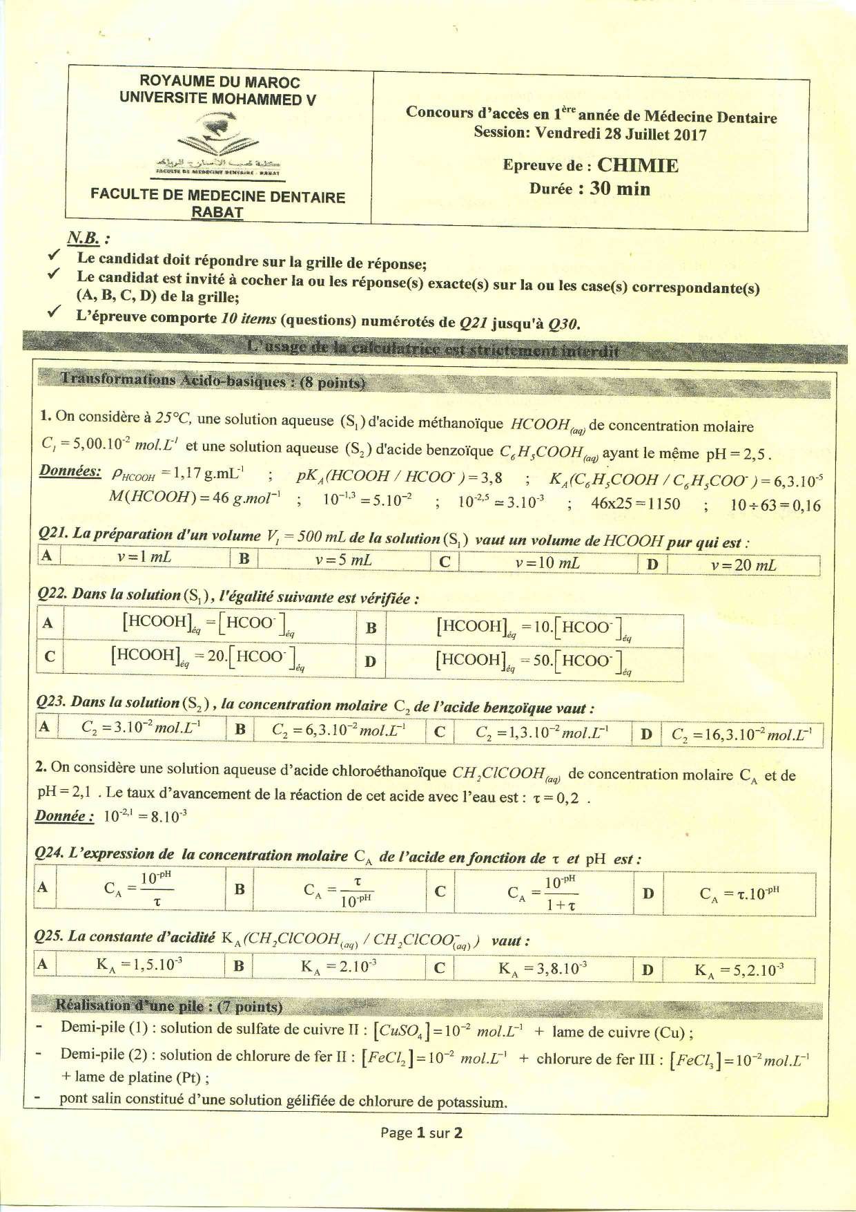 Concours d'accès à la Faculté de Médecine Dentaire (Rabat) 2017 - Sujet