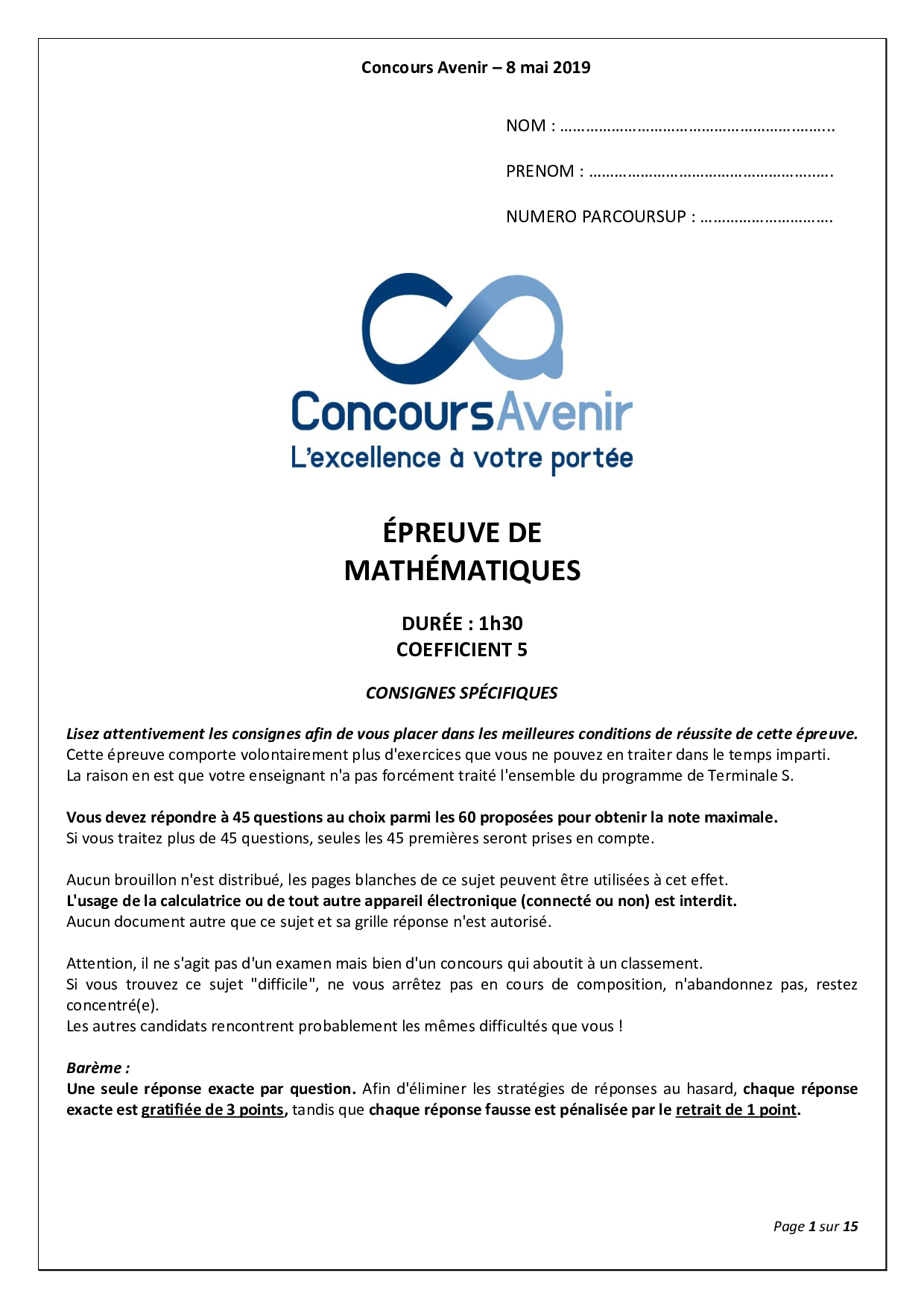 Concours AVENIR 2019 - Mathématiques (Sujet)
