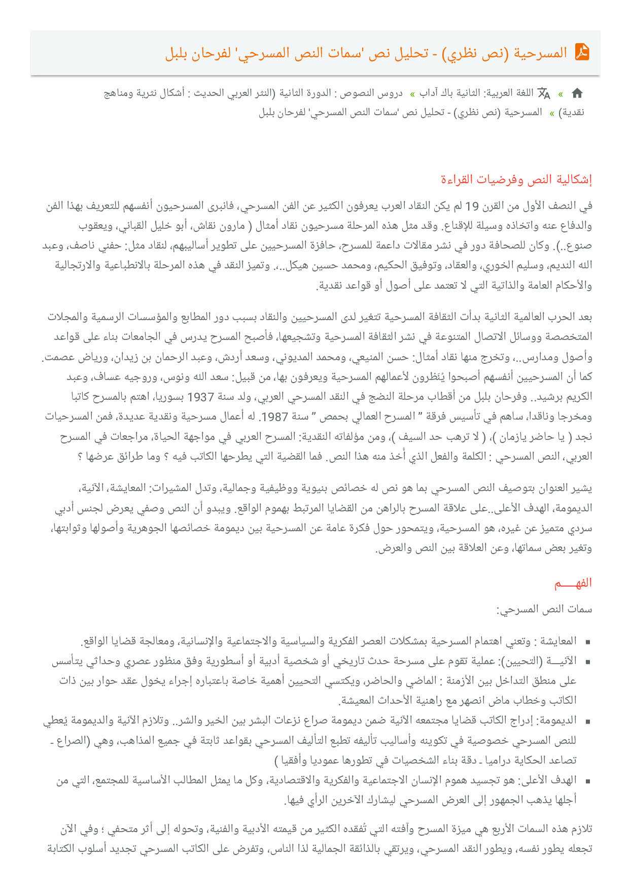 المسرحية (نص نظري) - تحليل نص 'سمات النص المسرحي' لفرحان بلبل