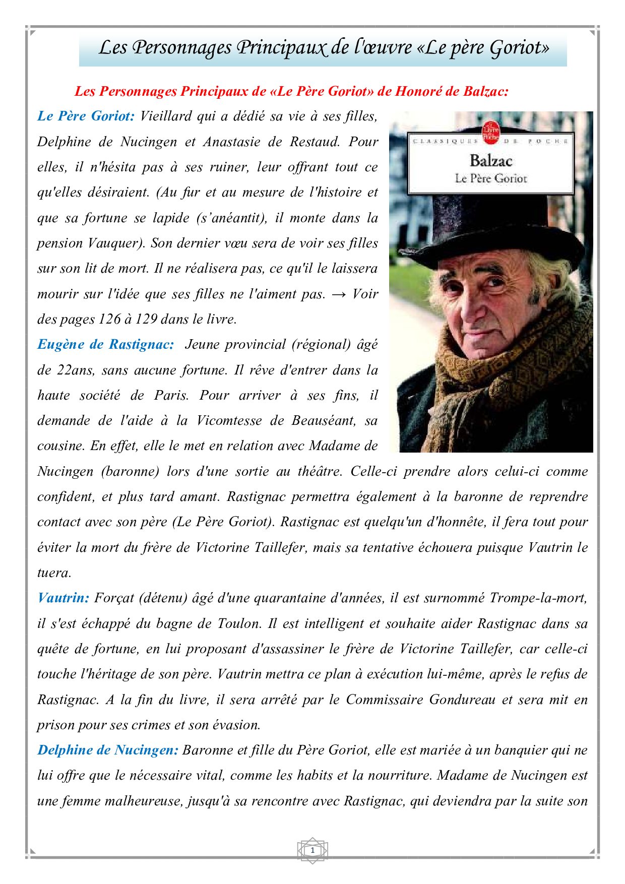 Le Père Goriot - Personnages principaux