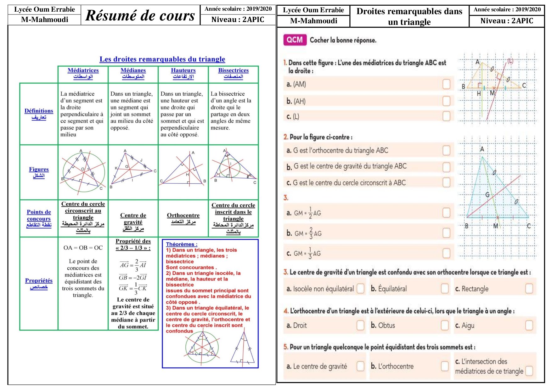 Droites remarquables dans un triangle - Résumé de cours (MA)
