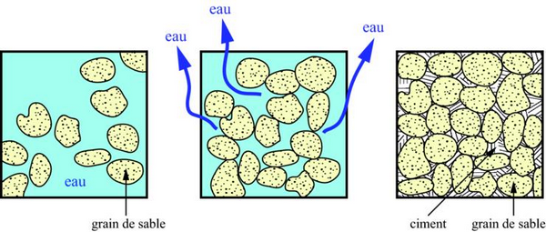 - La cimentation ou lithification : les sédiments se lient entre eux par un ciment d’origine chimique. Les sédiments se transforment alors en une roche solide.