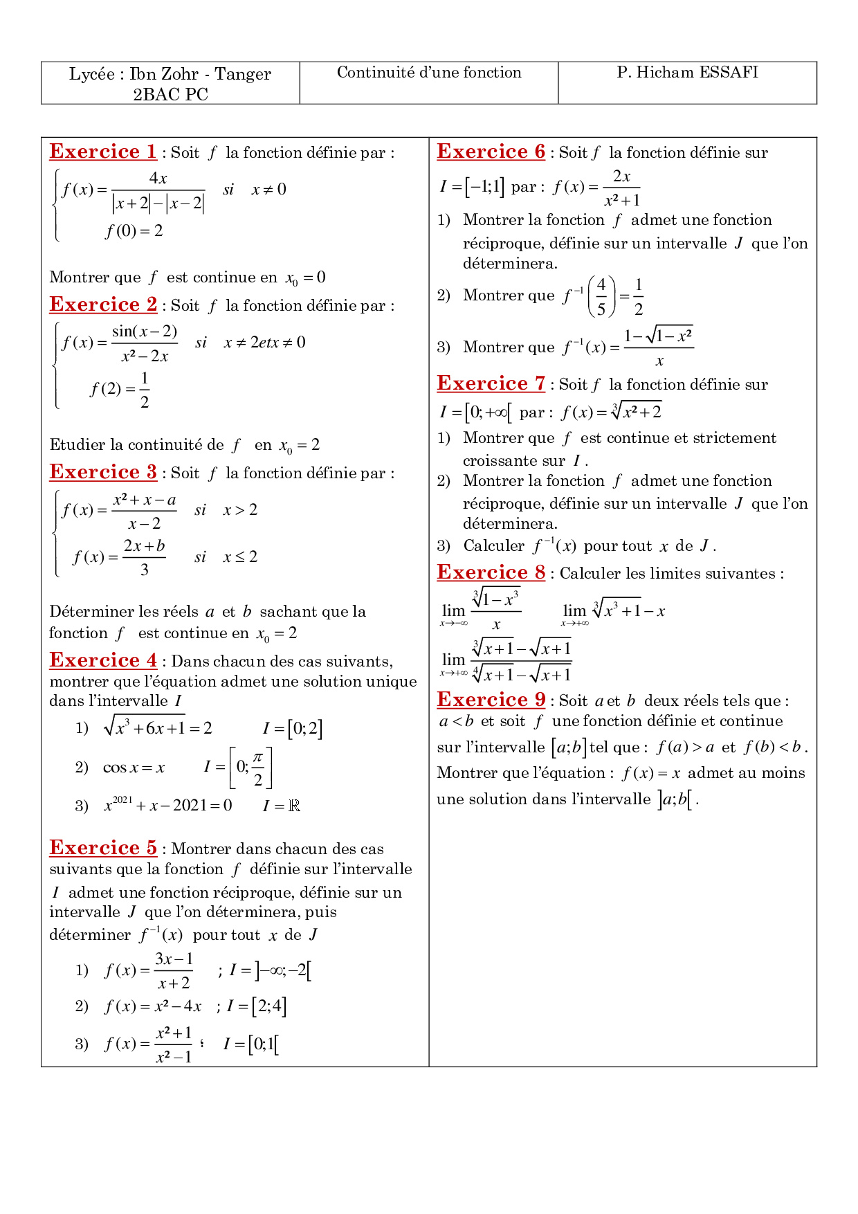 Limites et continuité - Exercices non corrigés 9