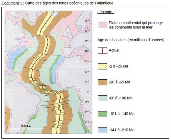 Les géologues ont réussi à déterminer l’âge de la croûte océanique composée de basaltes (roche volcanique), en différents endroits de chaque côté de la dorsale médio-atlantique (un relief sous-marin qui se situe au milieu de l’océan Atlantique).