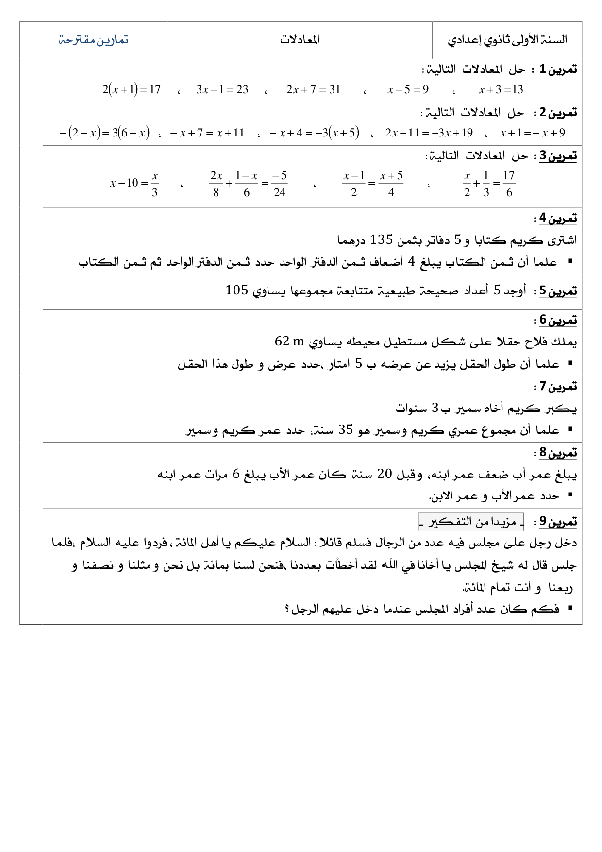 المعادلات - سلسلة التمارين 1