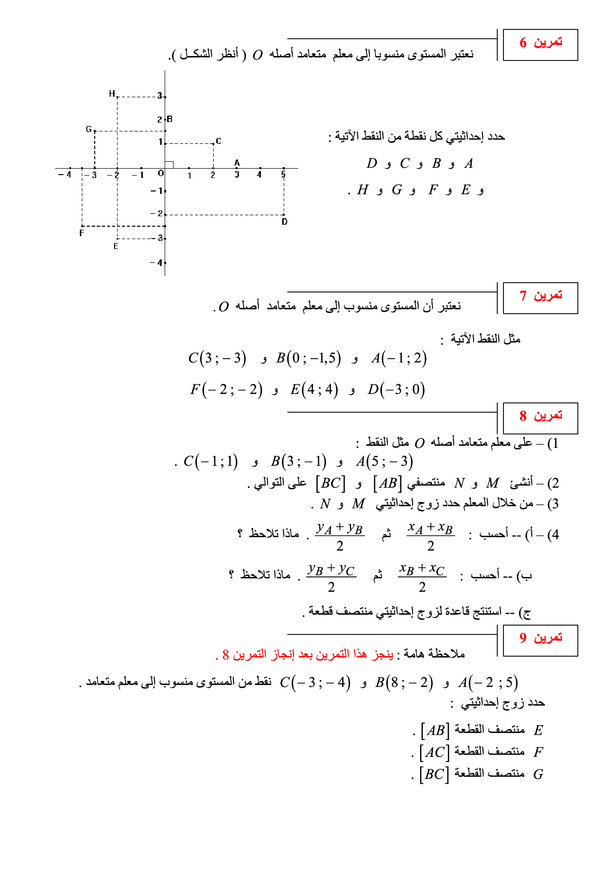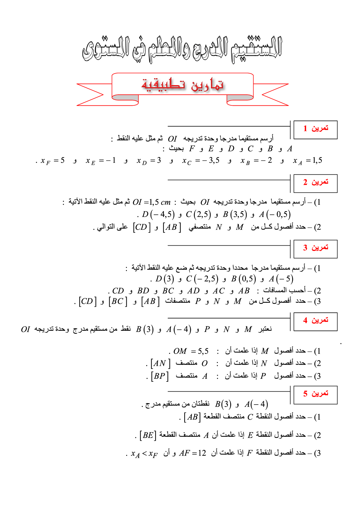 المستقيم المدرج والمعلم في المستوى - تمارين تطبيقية