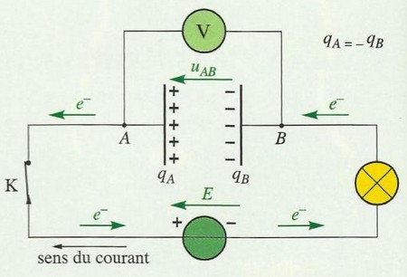 On dit que le condensateur est chargé et le courant électrique qui passe dans le circuit s'appelle courant de charge.