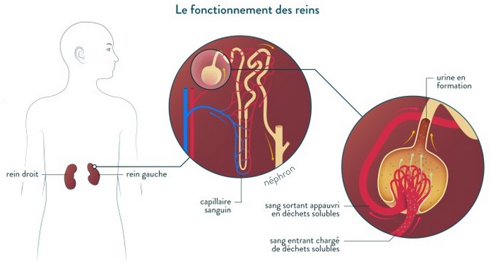 Les deux reins sont traversés quotidiennement d'environ 1700 litres de sang, autrement dit les 5 litres de sang que contient notre organisme traversent les reins 350 fois par jour.