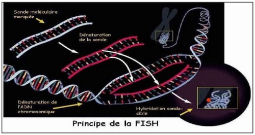 La sonde porte une substance fluorescente qui sera facilement détectable, d’où l’appellation de l’hybridation in situ en fluorescence (FISH).