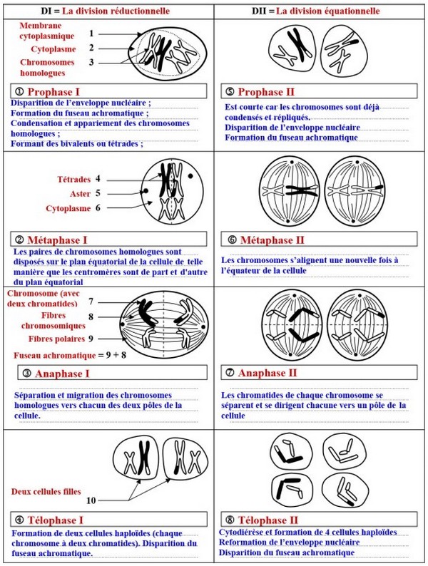 Le tableau suivant illustre les étapes de la méiose (Pour simplifier, deux paires de chromosomes uniquement ont été représentés) :