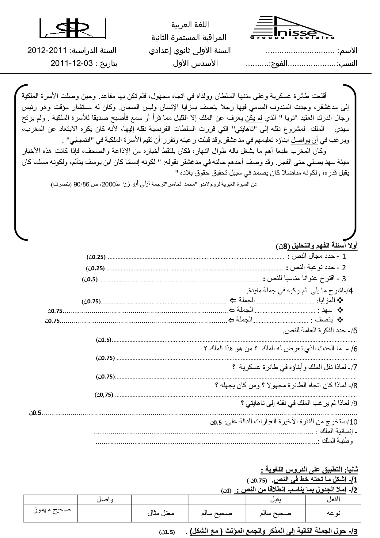 الفرض 2 نموذج 1 - اللغة العربية أولى إعدادي الدورة الأولى