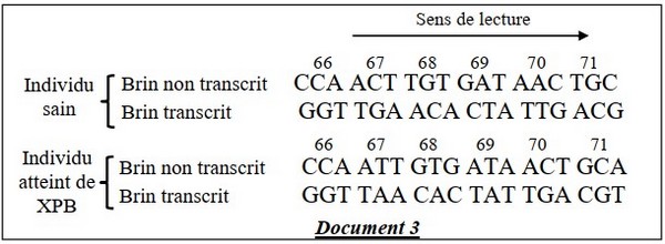 Le document 3 présente la séquence nucléotidique d’une partie du gène codant pour l’enzyme ERCC3 chez un individu sain et un autre individu atteint de XPB :
