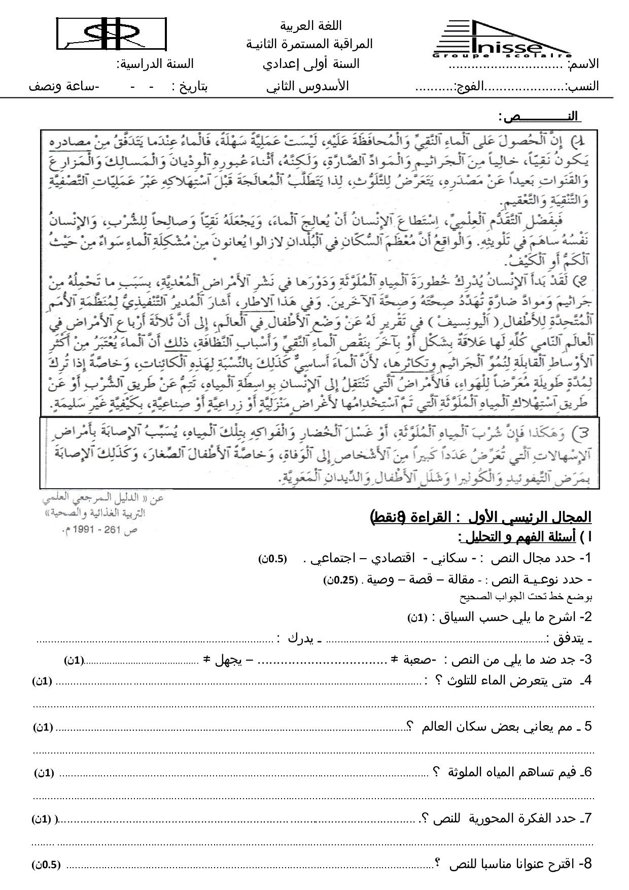 الفرض 2 نموذج 2 - اللغة العربية أولى إعدادي الدورة الثانية