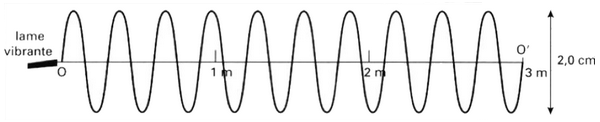 Une lame vibrante en mouvement sinusoïdal de fréquence , fixée à l’extrémité d’une corde de longueur , génère le long de celle-ci une onde progressive périodique.