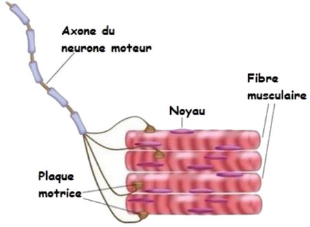 La jonction neuromusculaire ou plaque motrice est une synapse qui s’établit entre un neurone moteur et une fibre musculaire (= cellule musculaire).