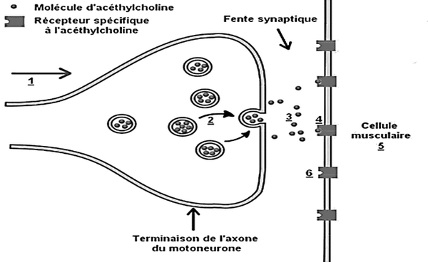 Au niveau de la plaque motrice, les messages nerveux moteurs passent des fibres nerveuses aux fibres musculaires par un médiateur chimique appelé l’Acétylcholine ce qui provoque la contraction musculaire.