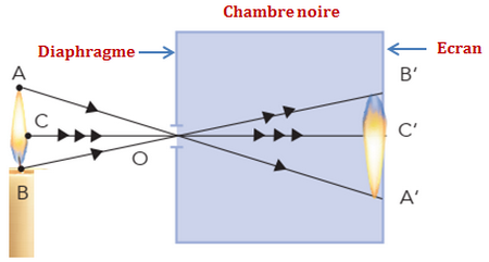 On obtient sur l'écran de la chambre noire une image A'B' renversée par rapport à l'objet AB (la bougie allumée).