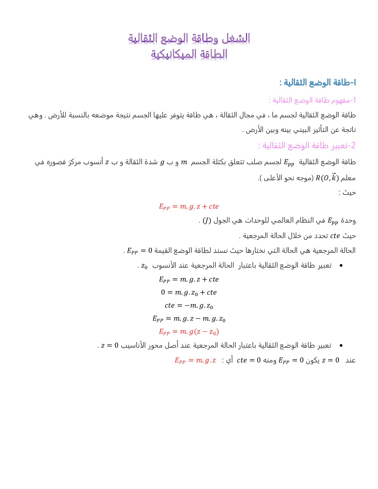 الشغل وطاقة الوضع الثقالية - الطاقة الميكانيكية - الدرس 2