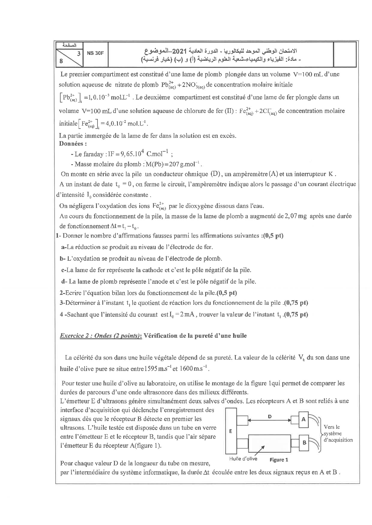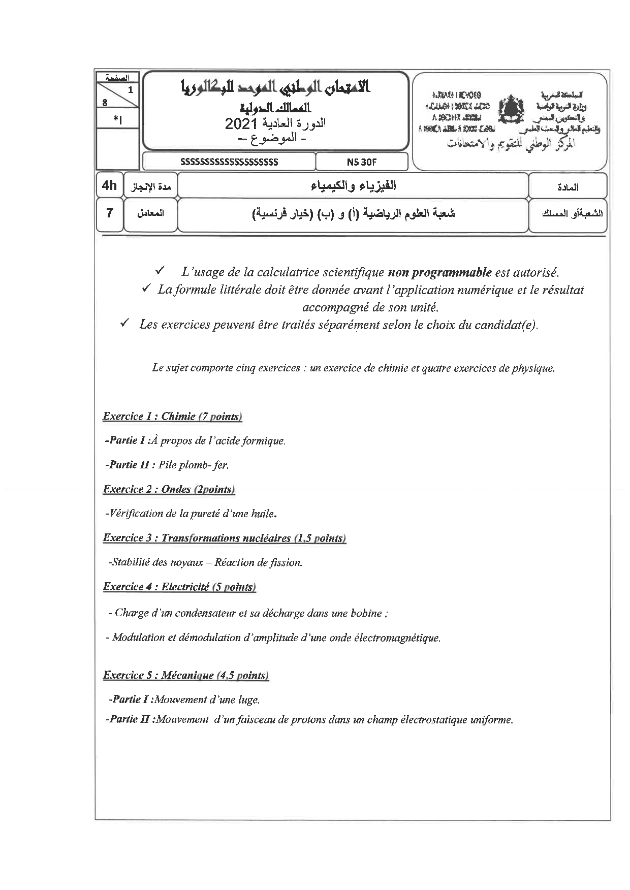 Examen National Physique-Chimie Sciences Maths 2021 Normale - Sujet