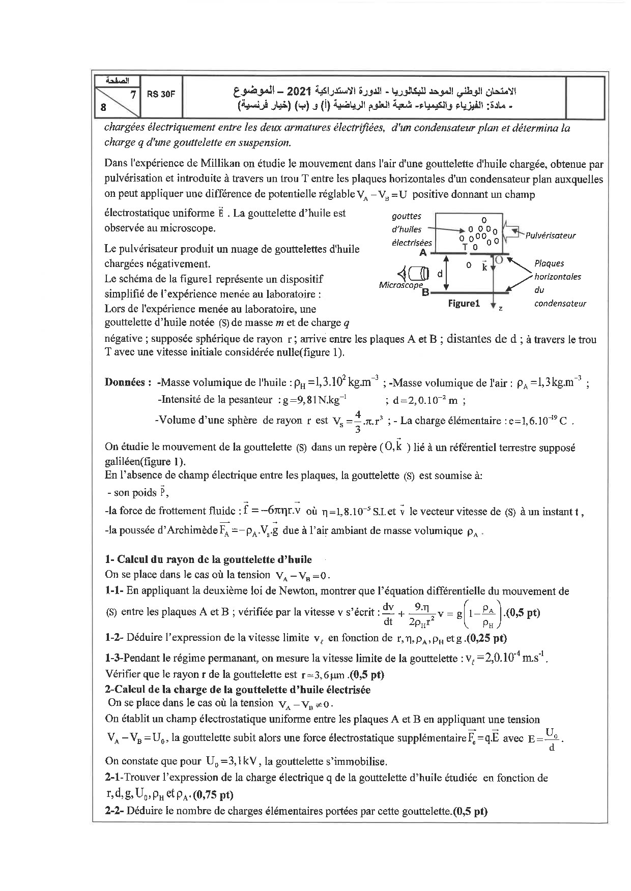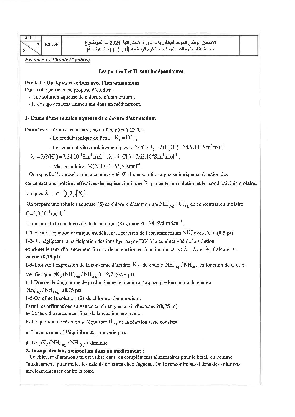 Examen National Physique-Chimie Sciences Maths 2021 Rattrapage - Sujet