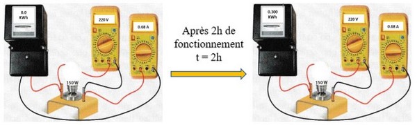 Au début de l’expérience le compteur électrique affiche la valeur 0KWh et à la fin de l’expérience (après 2h) le compteur affiche la valeur 0,3KWh=300Wh.