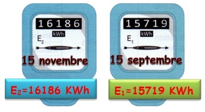 Pour calculer la consommation d’énergie électrique E pendant une période définie, on fait la différence entre la valeur affichée sur le compteur à la fin de la période et la valeur affichée sur le compteur au début de la période :