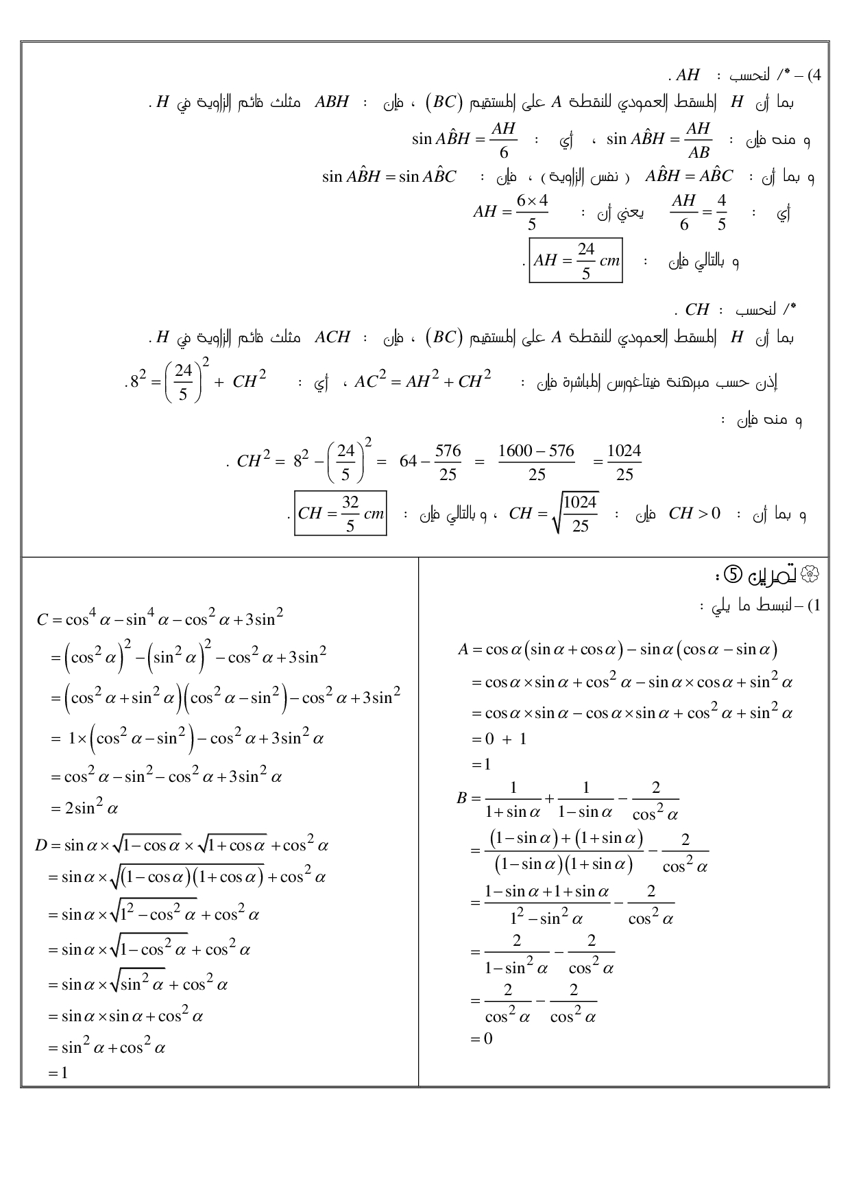 المثلث القائم الزاوية والحساب المثلثي - تصحيح سلسلة التمارين 2