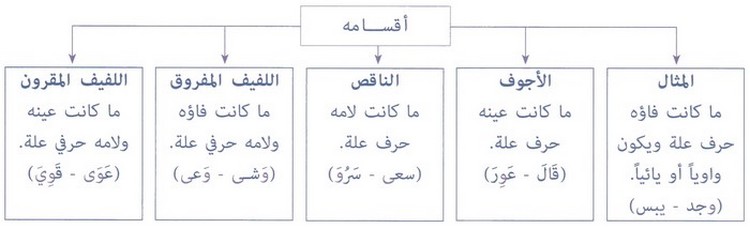 الفعل المعتل هو ما كان أحد حروفه الأصلية حرف علة، وهو خمسه أقسام :