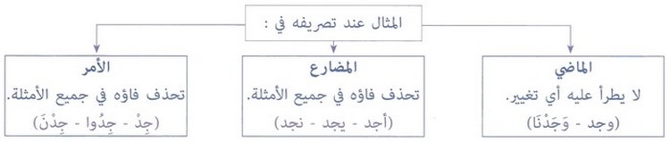 إذا كان المثال واويا من باب (فَعَلَ يَفْعَلُ) أو (فَعَلَ يَفْعِلُ)، فان فاءه تحذف في المضارع والأمر. أما إذا كان واويا من غير هذين البابين أو كان مثالا يائيا، فلا يلحقه أي تغيير.