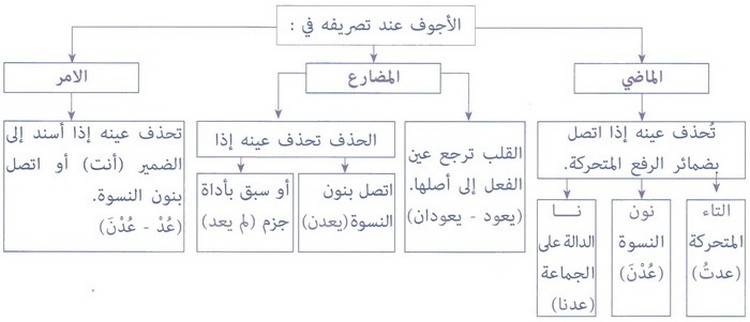 تحذف عين الأجوف في الماضي والمضارع والأمر إذا اسند إلى ضمائر الرفع المتحركة، أو إذا سكن آخره.