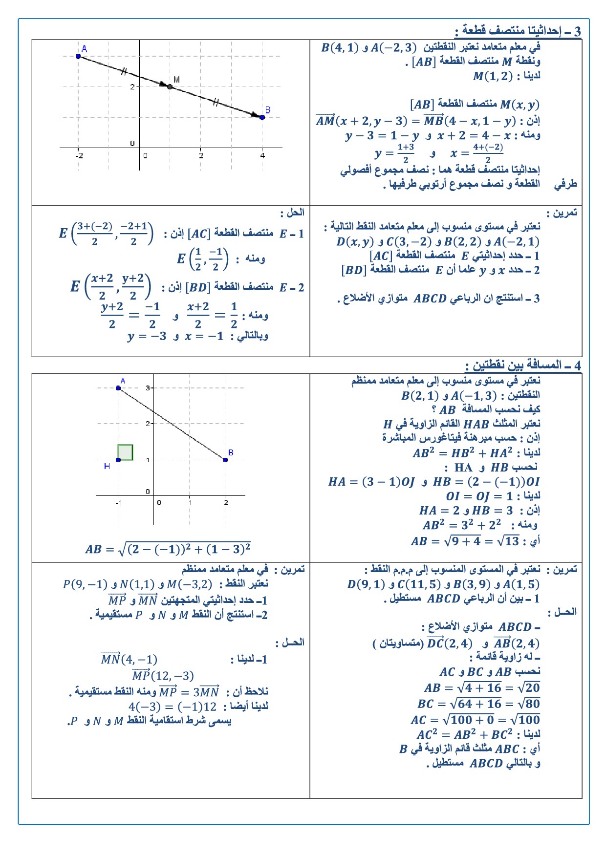المعلم في المستوى - إحداثيتا نقطة - إحداثيتا متجهة - ملخص الدرس 1