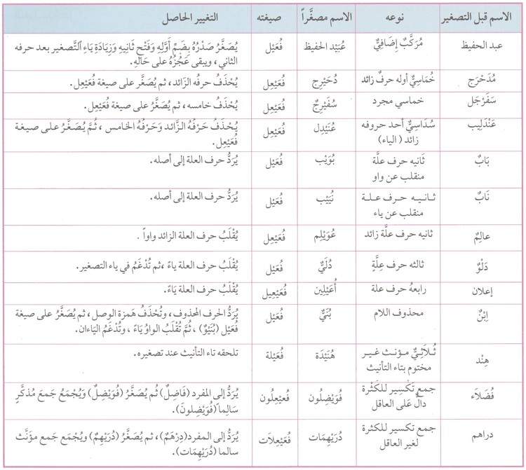 | الاسم | التصغير | التغيير الذي وقع فيها |