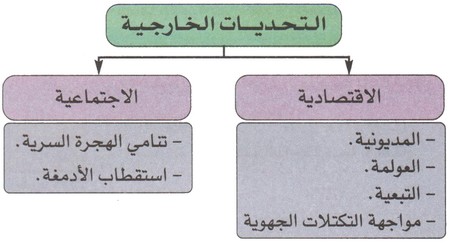 - تحديات اقتصادية: وتتمثل في ارتفاع المديونية والتبعية للخارج، ومواجهة شبح العولمة و ، مواجهة التكتلات الجهوية.