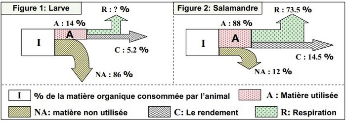 Les figures du document suivant, donnent les résultats de cette étude quantitative dans le cas d’un consommateur herbivore (Larve), et un consommateur carnivore (Salamandre) :
