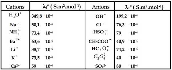 Les ions et ont une conductivité molaire ionique nettement plus grande que celle des autres ions, donc leur présence dans une solution confère à celle-ci une conductivité importante.