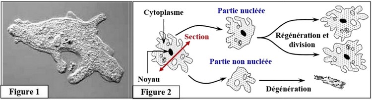 On a mit en évidence le rôle du noyau en réalisant l’expérience de mérotomie qui consiste a couper une amibe en 2 parties (Figure 2).