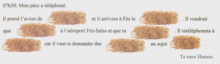 En rentrant du collège, je trouve un petit mot, laissé par ma sœur, sur la table de nuit. Malheureusement, par mégarde, elle a laissé une tasse de café dessus et quelques informations ne sont plus claires.