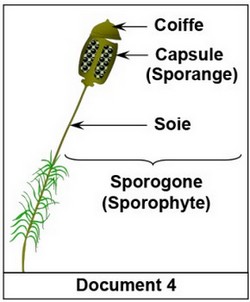Quelque temps après, sur le pied 2, on voit se développer un nouvel organe, le sporogone (document 4) dont la capsule contient des spores.