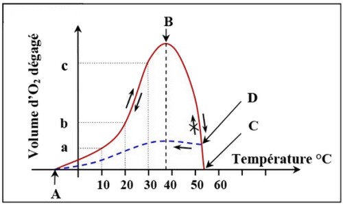 Si on diminue progressivement la température à partir du point D, on constate que le volume de dioxygène dégagé diminue sans atteindre la valeur B enregistré dans la température optimale.