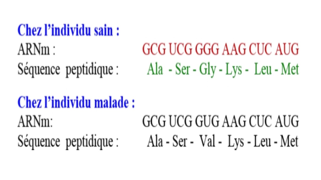 - En vous basant sur les deux figures a et b, déterminez la séquence de l’ARNm et celle de la chaîne peptidique de la rhodopsine chez l’individu sain et chez l’individu malade, puis montrez la relation : gène- protéine- caractère.