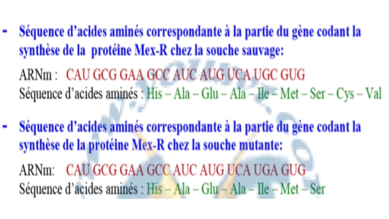 - En utilisant les données des documents 3 et 4, déterminez la séquence des acides aminés correspondante à chaque partie du gène contrôlant la synthèse de la protéine Mex.R chez les deux souches bactériennes étudiées, et expliquez l’origine héréditaire de la résistance observée chez la souche mutante.