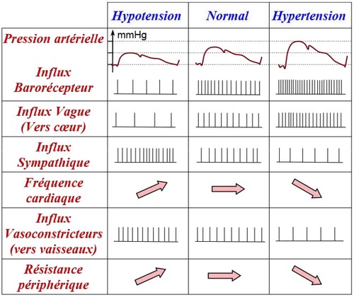 La régulation de la pression artérielle est une action réflexe, faisant intervenir des mécanismes nerveux involontaires rapides et se présente comme suit :