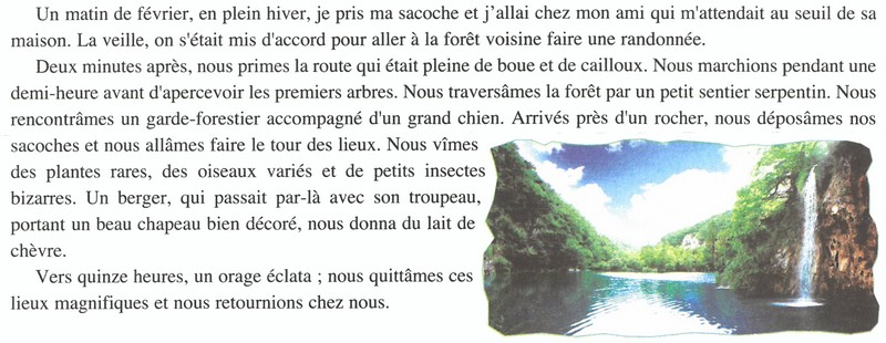 | Le week-end dernier, j'étais allée à la campagne chez mes grands-parents. Moi, ma sœur et ma cousine nous étions parties vers 8 heures du matin nous promener dans les champs. Sur notre chemin, nous avions profité du paysage et ramassé des fleurs ; histoire de faire une décoration dans la maison. Nous étions arrivées dans un endroit calme, l'air était frais à sentir. Nous avions donc décidé de faire un pique-nique sur l'herbe douce. Puis, nous avions continué notre exploration. En notre compagnie, il y avait notre chien qui lui aussi avait aimé la promenade. Au coucher du soleil, nous étions rentrées à la maison. |