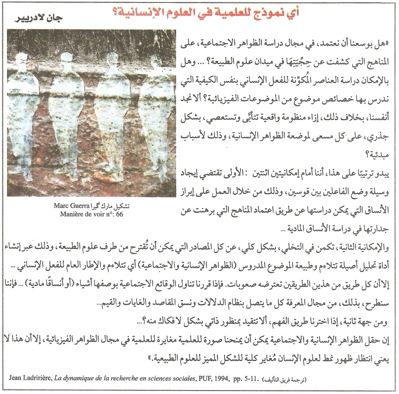 في هذا النص يتساءل لادريير عن النموذج العلمي المناسب لمعالجة الظواهر والحوادث الإنسانية : هل هو المنهج الديكارتي الذي يدعو إليه إميل دوركهايم، وهو منهج يقارب الظاهرة المبحوثة كشيء ويضع «ذات الباحث بين قوسين»، أم «المنهج التفهمي» الذي يمثله ماكس فيبر، ويعنى بالنوايا والدلالات والمقاصد ؟ لكنه يخلص إلى أهمية «تدشين صورة مغايرة للعلمية» في العلوم الإنسانية.