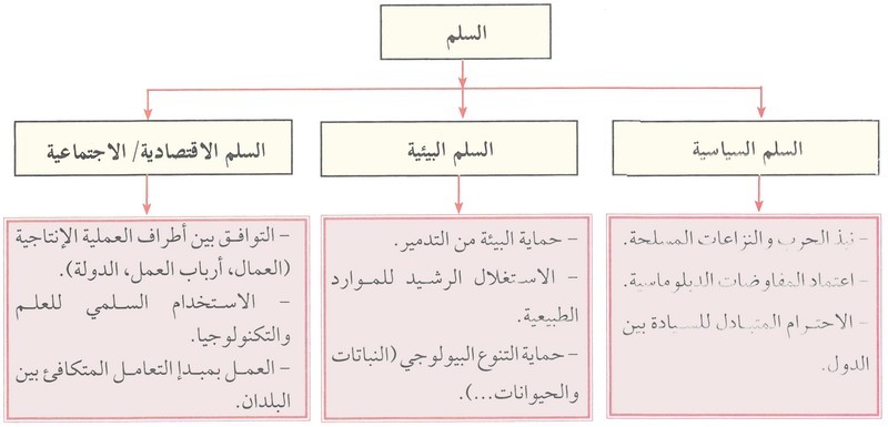 - السلم السياسي: ويقتضي نبذ الحروب والصراعات المسلحة، واعتماد المفاوضات لحل الخلافات بين الشعوب.
