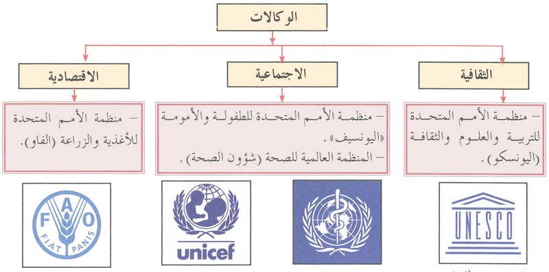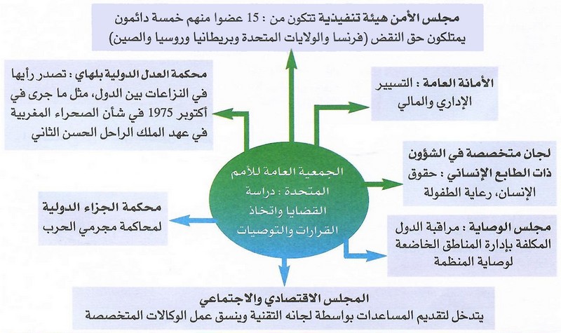هيئة الأمم المتحدة: الأمم المتحدة هيئة دولية مقرها بنيويورك (الولايات المتحدة الأمريكية)، تأسست بعد الحرب العالمية الثانية بموجب معاهدة سان فرانسيسكو سنة 1945، بهدف اقرار السلم العالمي، وحل الصراعات بين الدول بطرق سلمية، وتعزيز احترام حقوق الإنسان، ويشرف عليها مجلس الأمن، وتضم عدة وكالات ثقافية كمنظمة الأمم المتحدة للتربية والعلوم والثقافة (اليونسكو)، يوجد مقرها بباريس، هدفها تحقيق التعاون الثقافي والتربوي بين الدول، واقتصادية كمنظمة التغذية والزراعة (الفاو)، يوجد مقرها بروما، هدفها رفع مستوى معيشة السكان، ومساعدة المزارعين، واجتماعية كمنظمة الصحة العالمية الذي يوجد مقرها بجنيف، هدفها الوصول إلى أفضل مستوى صحي عالمي عن طريق مكافحة الأوبئة والأمراض.