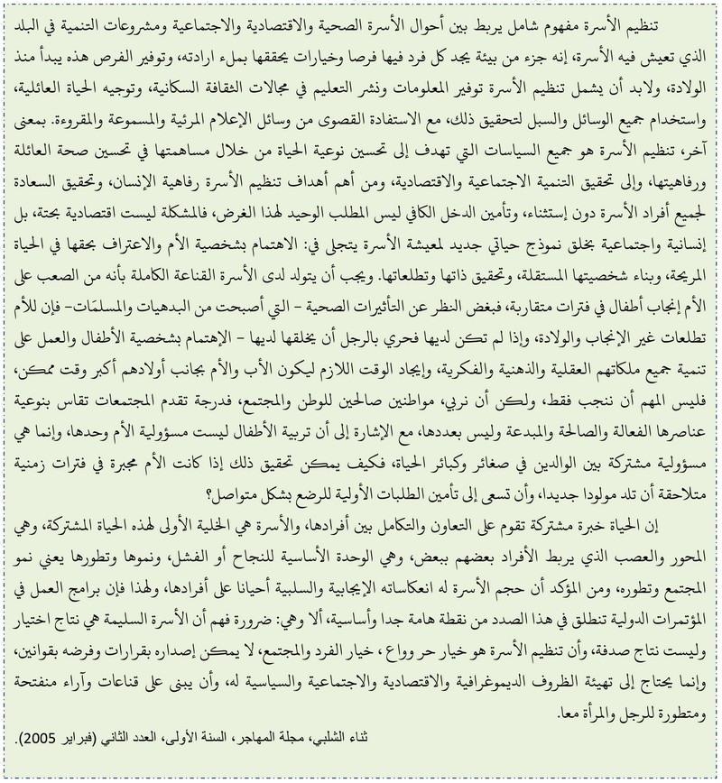 تبين الكاتبة مفهوم تنظيم الأسرة وارتباطه بأوضاع الأسرة الاجتماعية والاقتصادية والصحية وكذا بمشروعات التنمية في البلاد.